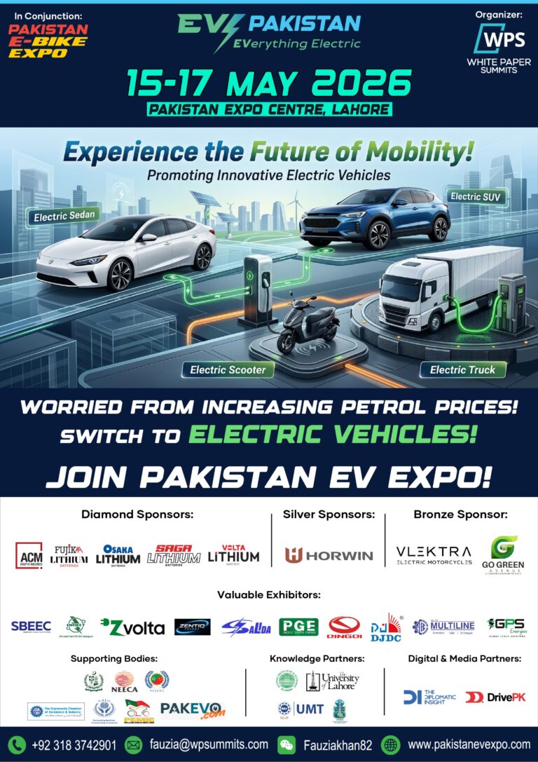 EV EXPO 2026 40 minutes ago36 minutes ago SBEEC joins EV EXPO’26 Get ready for the Pakistan EV Expo 2026 at the Expo Centre Lahore from May…